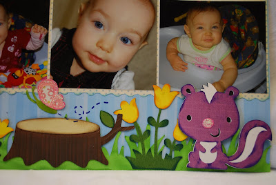 This is a layout of my daughter at 7 months.. I used the new Create A Critter cart (Which is so cute and surely a must have!!) to cut the skunk, stump, flowers, butterflies, and the sun.. The strip of grass is cut from Zooballoo.. I used SCAL to create the title... To finish the page I did some inking, added some pop dots, embossed the stump & sun, doodle with a marker, and added a touch of bling with some stickles..